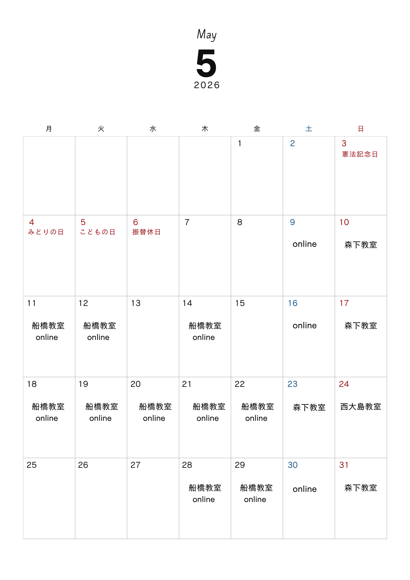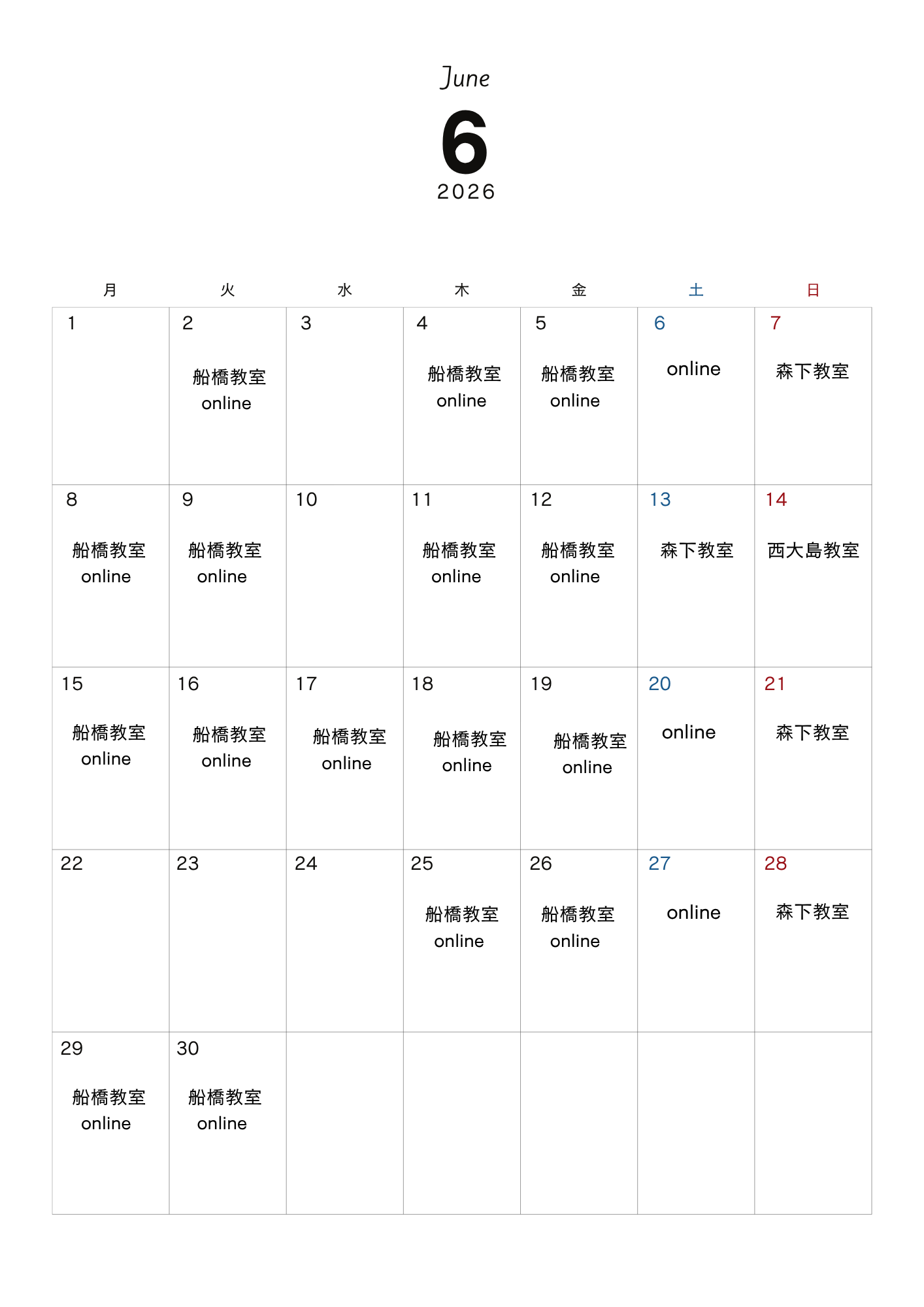 <4月・5月・6月対面教室開講日>